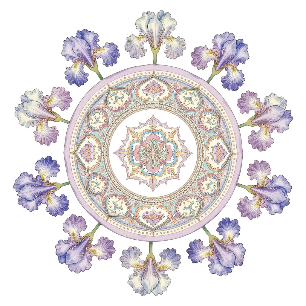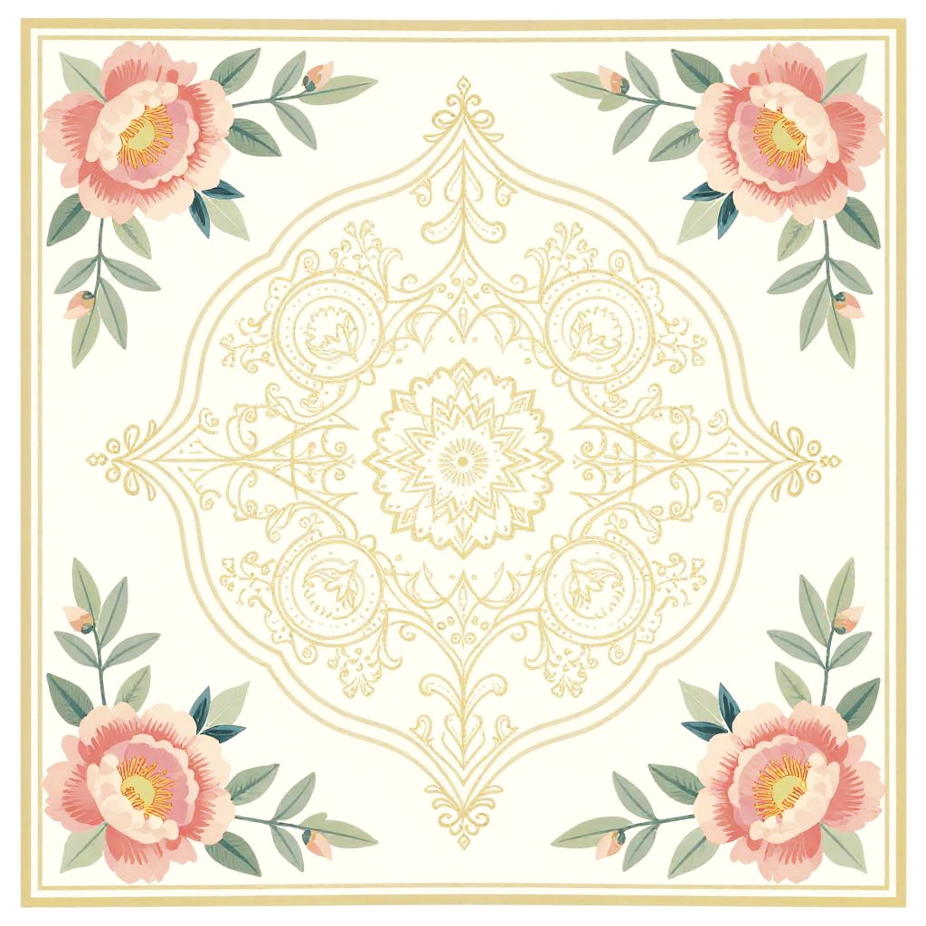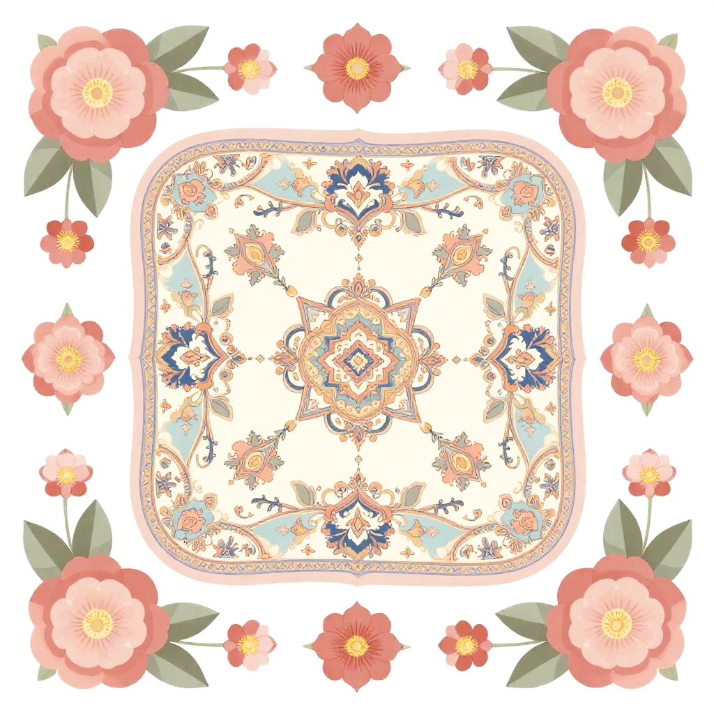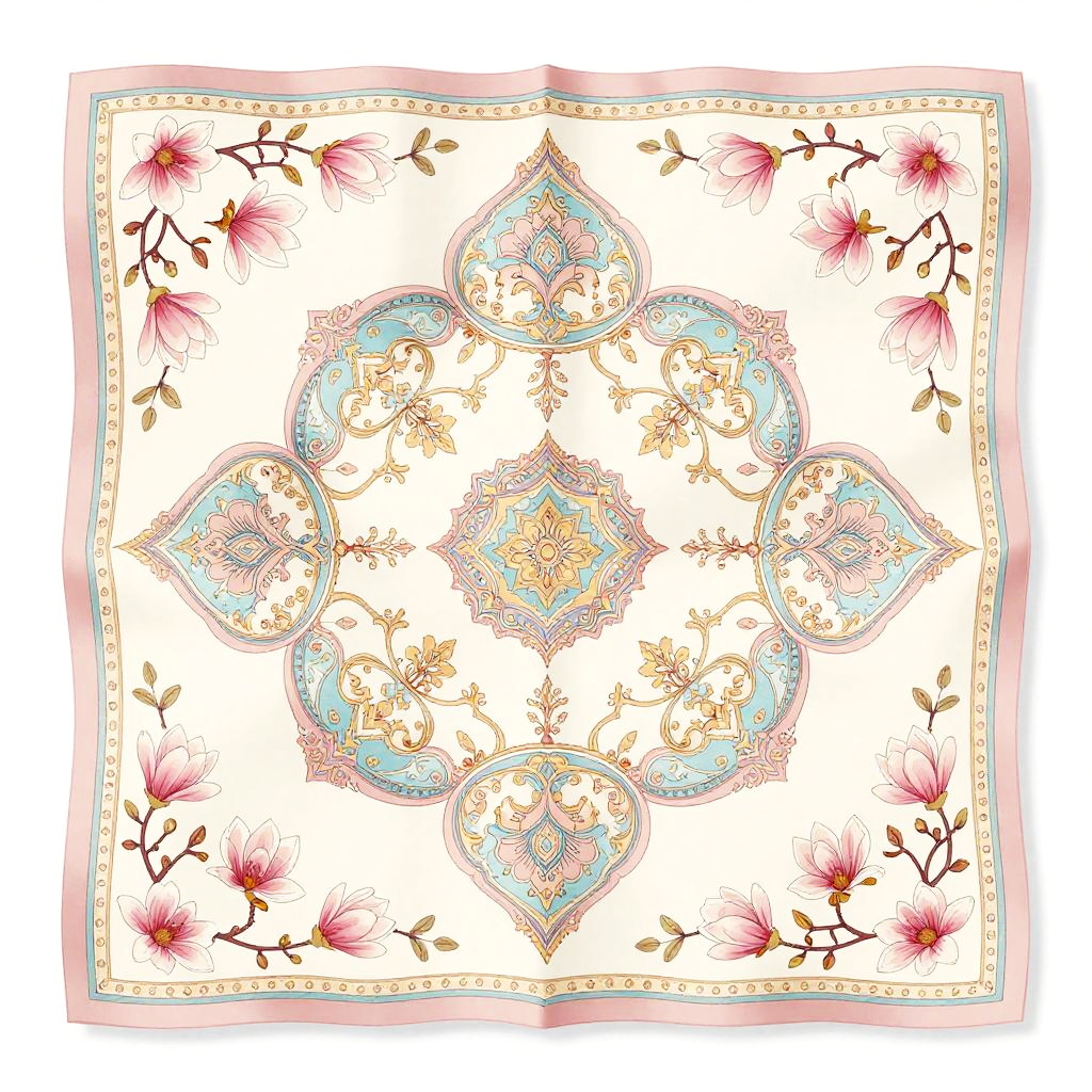 A cappella elegant, cute and beautiful 2D floral scarf vector pattern in faded colors, with orchid petals floating softly aligned on outer margins, the central area containing ancient caligraphic medallions enriched by flower arabesques, stylized, classic, expensive look