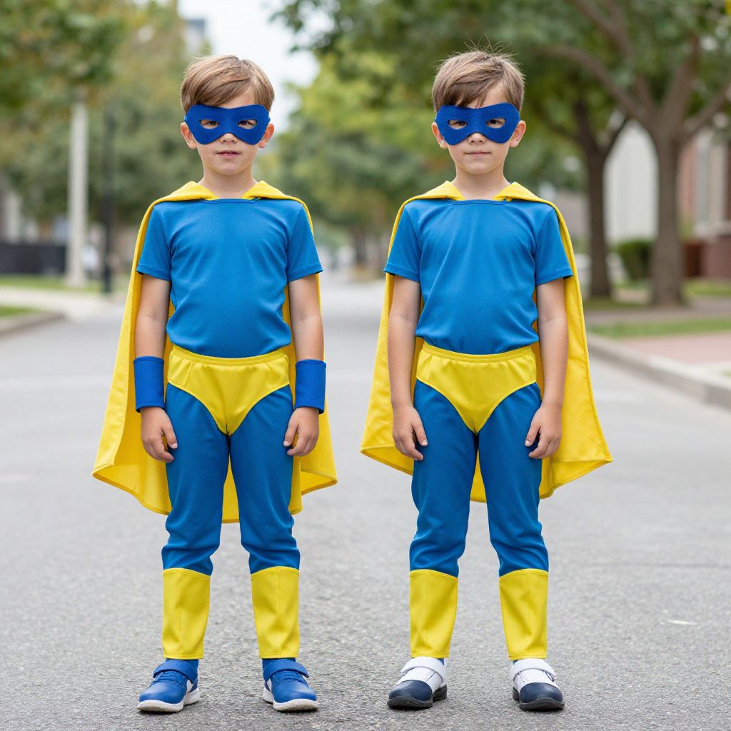 Photograph of two young boys dressed as superheroes, wearing blue and yellow costumes, blue masks, and capes, standing on a suburban street.