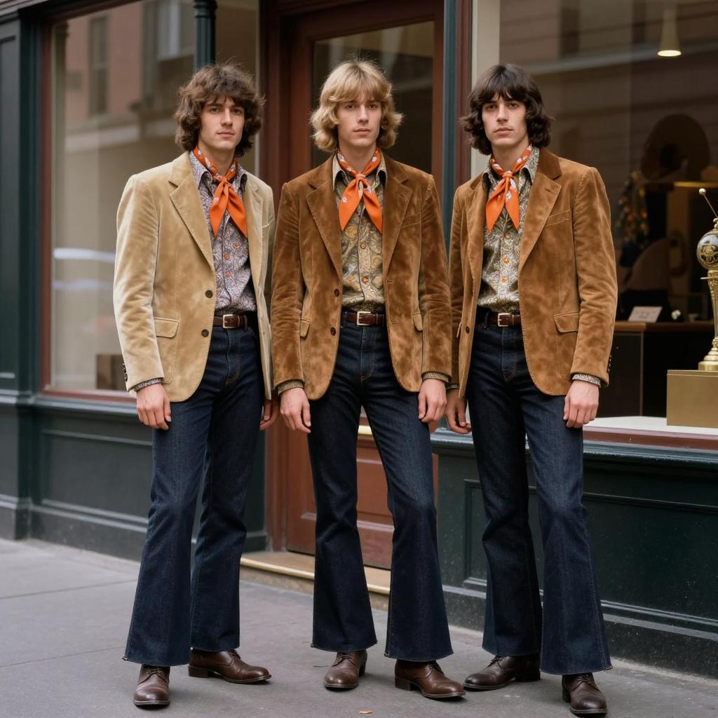1970s fashion outfits, three men in tailored menswear — suede jackets, patterned shirts, flared trousers and scarves — styled in camel corduroy blazer with dark denim bell-bottoms and orange scarf on three lean young men with medium-length shaggy 70s haircuts standing together in city sidewalk in front of 70s storefront windows under dramatic side lighting emphasizing textures of suede and wool, vintage mens fashion editorial, full body pose, 35mm film look