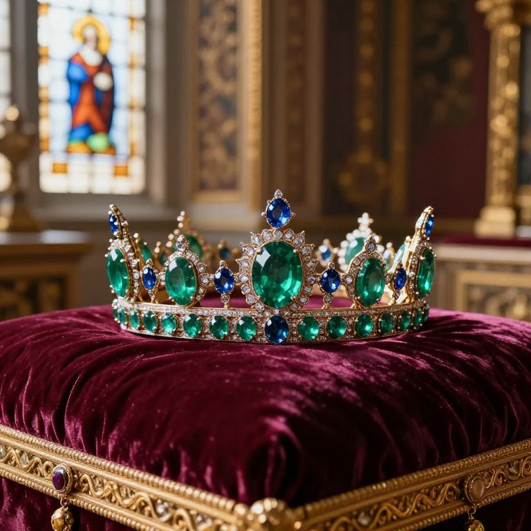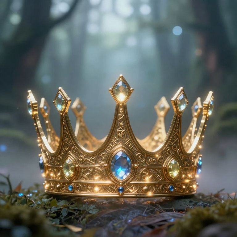 King fantasy crown shining with ethereal gemstones, ancient gold intricately decorated with magical runes, glowing softly amidst a misty enchanted forest background, mystical and regal ambiance