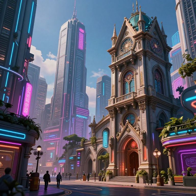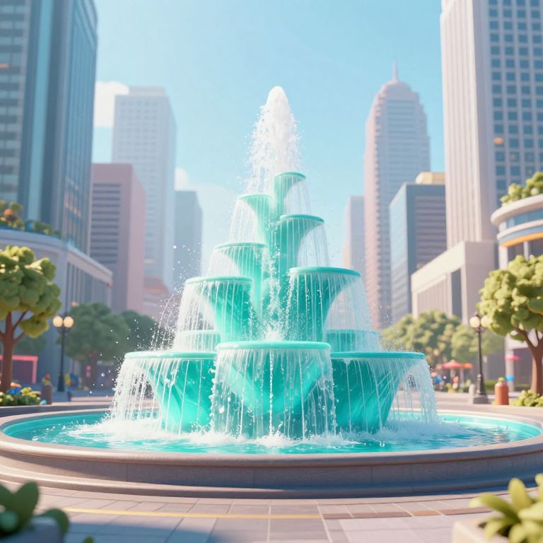 A futuristic 3D-rendered scene depicts a surreal city square where a vibrant turquoise fountain ascends in cascading staircases, creating an illusion of levitation against a backdrop of modern skyscrapers bathed in soft, ethereal lighting.
