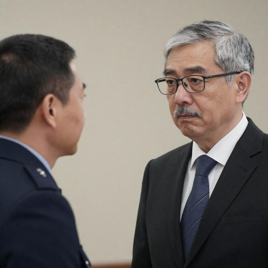 Middle-aged Asian man with gray hair, black round glasses, black suit, white shirt, black tie, white pocket square, seated on red leather chair. Background includes red leather chairs and green plants. Serious facial expression. Formal attire. Indoor setting.