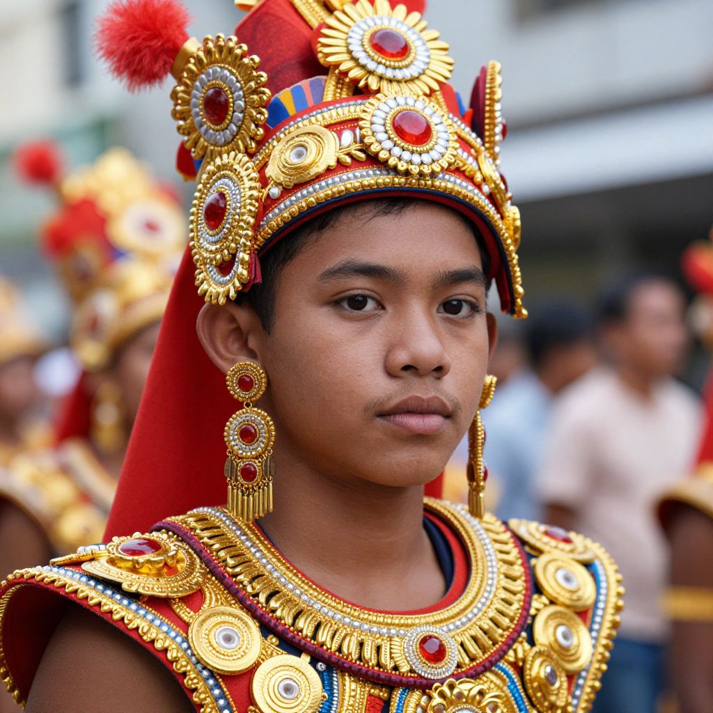 Photograph of a young Asian boy with medium brown skin and short black hair, wearing an ornate traditional headdress adorned with red and gold decorations and a large red pom-pom. He also wears a detailed, gold and red embroidered tunic with circular and floral patterns. His expression is neutral, and he has small, gold, circular earrings. In the blurred background, other people, some also wearing similar traditional attire, are visible. The setting appears to be an outdoor cultural event. The image is vivid, with bright colors and sharp details.