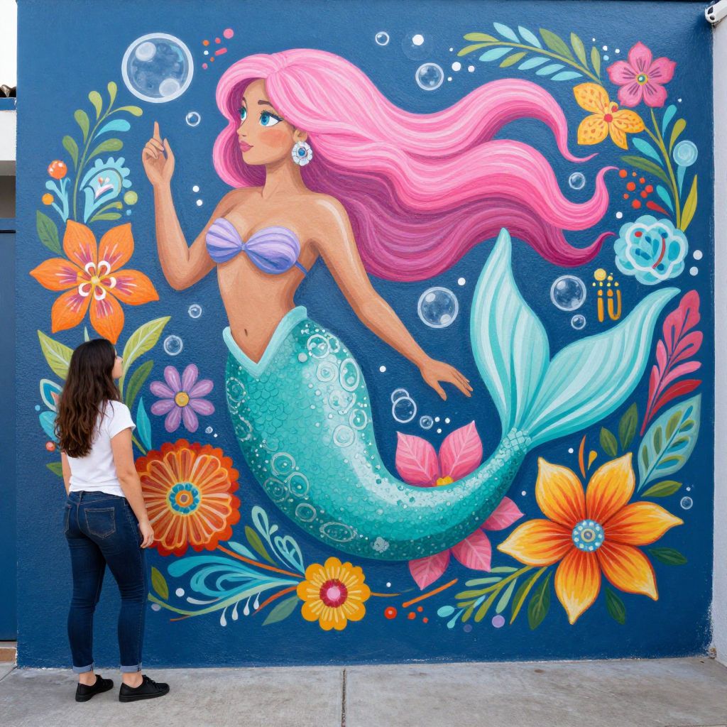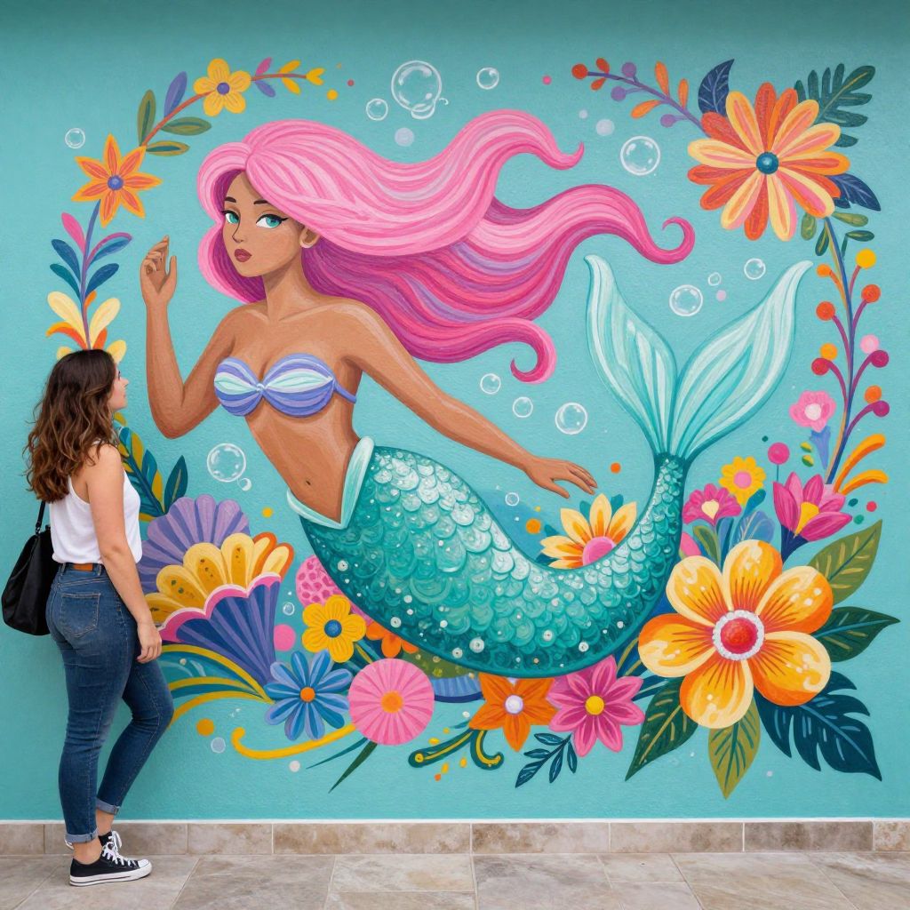 Photograph of a vibrant mural of a pink-haired mermaid with turquoise scales, surrounded by colorful flowers, bubbles, and a standing woman admiring the