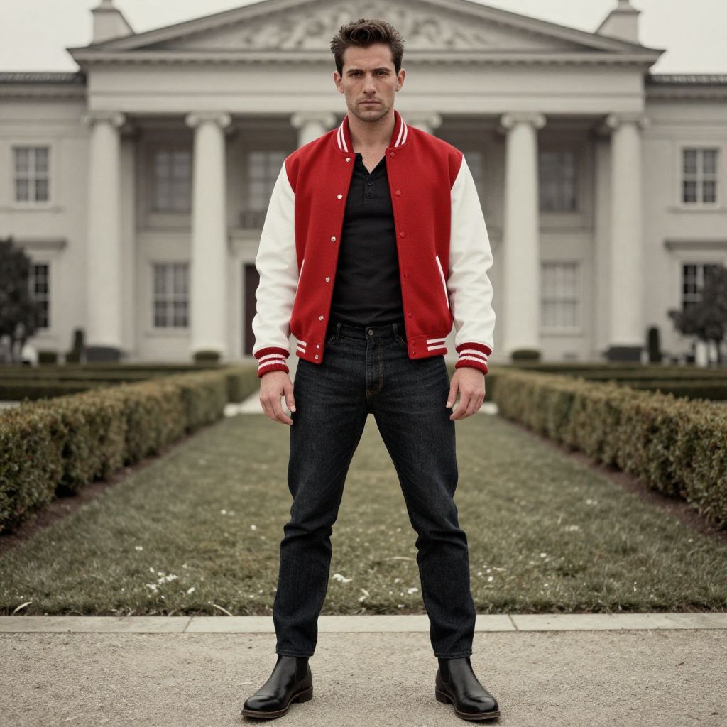A man, bold red and white varsity jacket, fitted black henley shirt, dark wash denim, sleek black Chelsea boots, neoclassical façade, grand columns, manicured gardens, calotype process, confident expression. Man has masculine face and piercing eyes