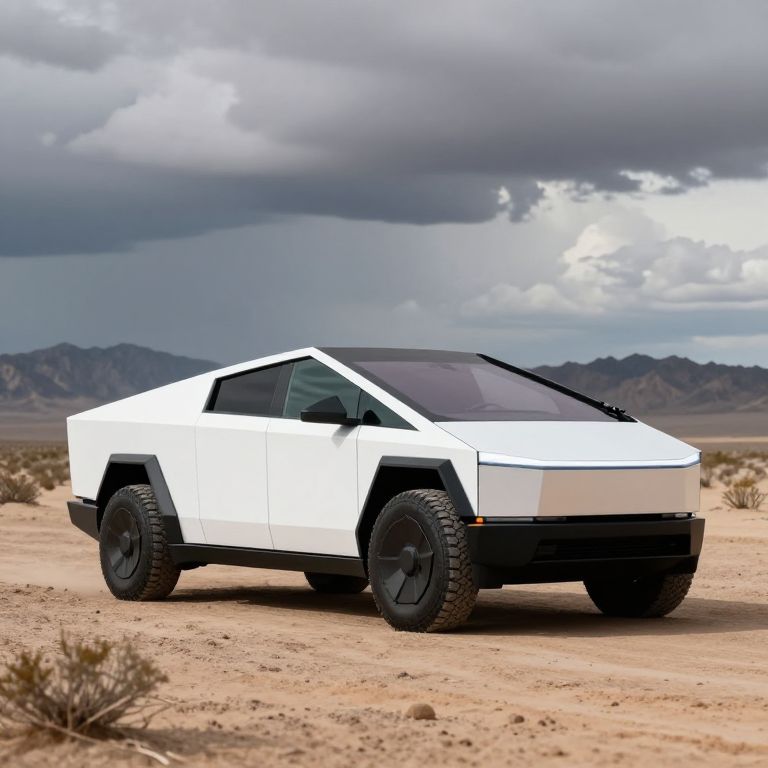 The image depicts a futuristic white cybertruck concept, standing prominently in a desert landscape. The vehicle features a sleek, angular design with a large, aerodynamic body and a series of large, rugged tires. The truck's windows are tinted, and it has a streamlined roof with various sensors and equipment. The surrounding environment is a vast, arid expanse with scattered shrubs and a distant mountain range under a dramatic, cloudy sky. The overall composition places the truck as the central focus, with the desert landscape and sky providing a stark, contrasting backdrop that highlights the vehicle's advanced and otherworldly appearance.