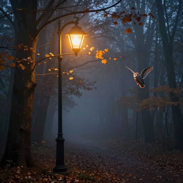 Photograph of a glowing streetlamp in a foggy, dark forest at night, with an owl mid-flight and autumn leaves on branches.