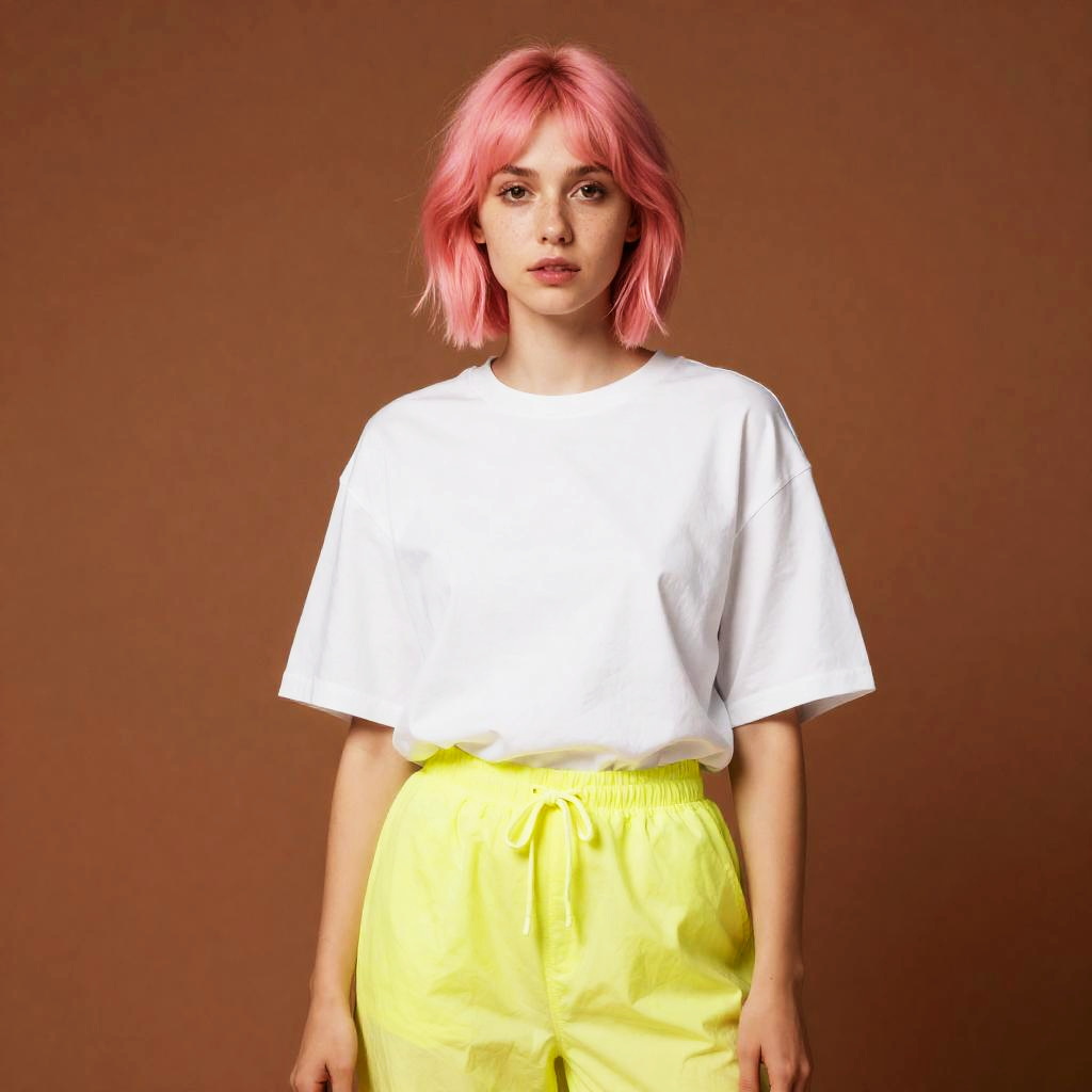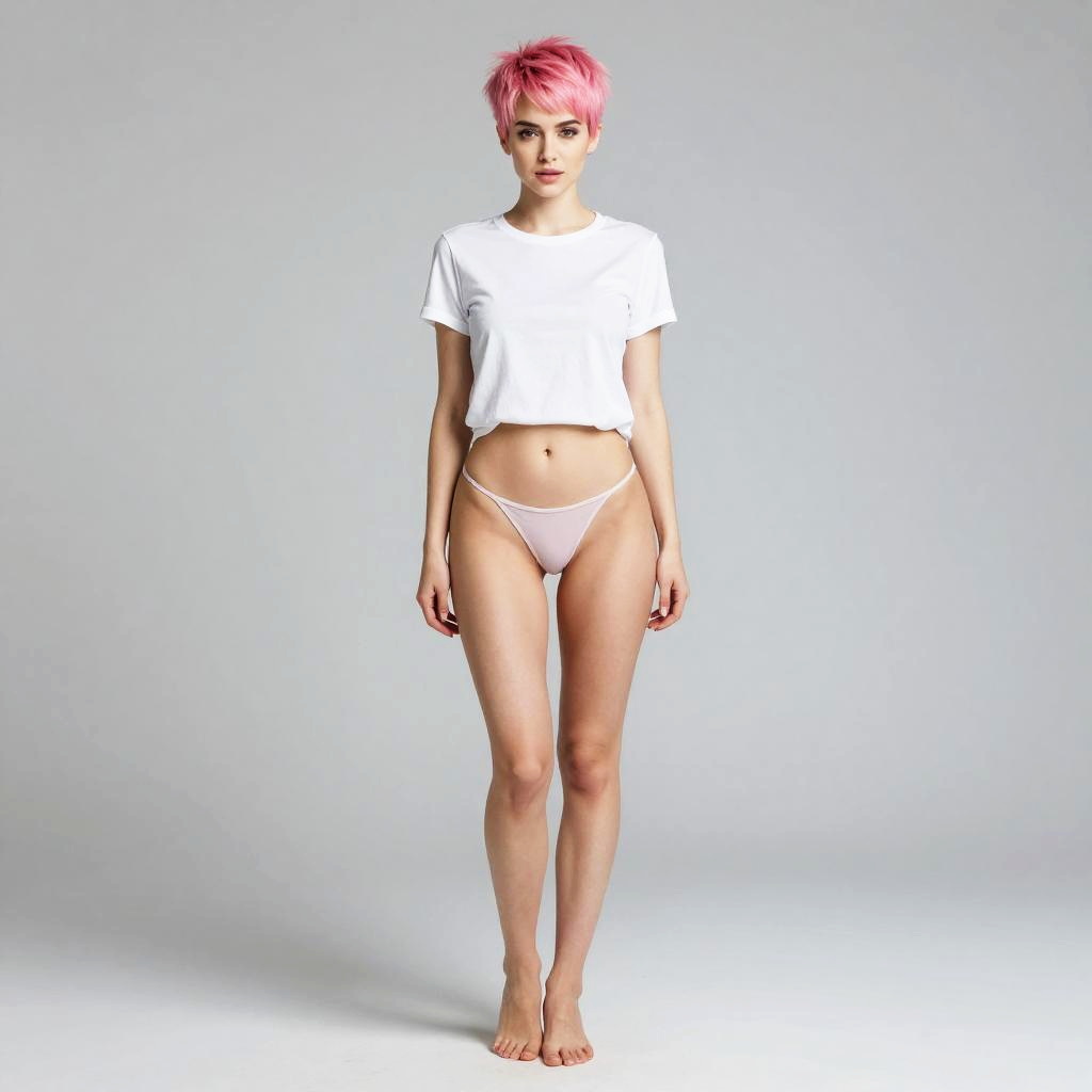 A beautiful woman, pink pixie hair, fullbody, wearing basic thong, wearing t-shirt, ((8k, RAW photo, best quality, ultra high res, photo-realistic, masterpiece))