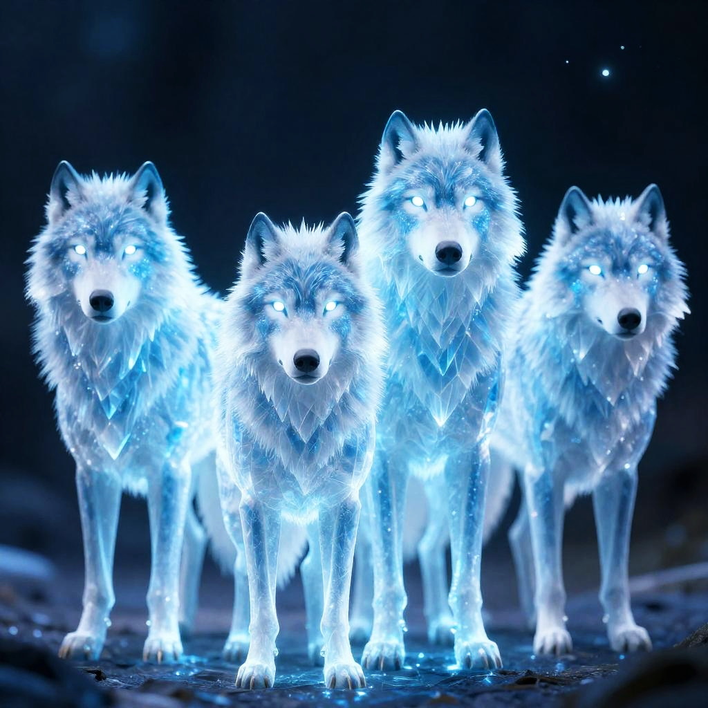 Digital art of four glowing blue, crystalline wolves with spiky, luminescent fur and bright white eyes. They stand in a dark, starry background, their icy ures and ethereal lights creating a magical, otherworldly atmosphere.
