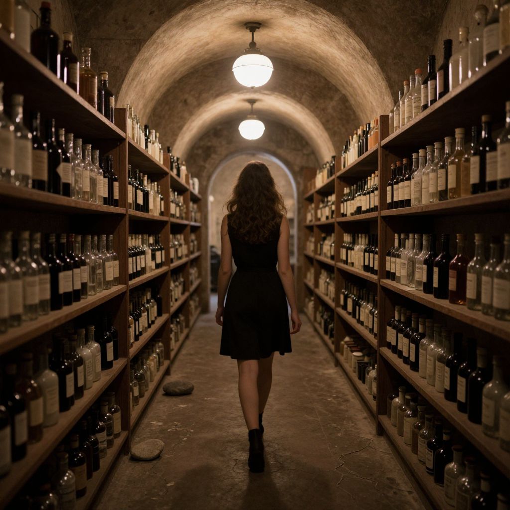 Photograph of a woman with long, wavy brown hair, wearing a black sleeveless dress and black ankle boots, walking down a dimly lit wine cellar aisle. The arched ceiling is made of rough stone, with two round white lights hanging from the center. On both sides, wooden shelves are lined with numerous wine bottles, creating a symmetrical pattern. The floor is made of worn stone, adding to the rustic ambiance. The woman is centered, viewed from behind, with a blurred background highlighting the depth of the cellar.