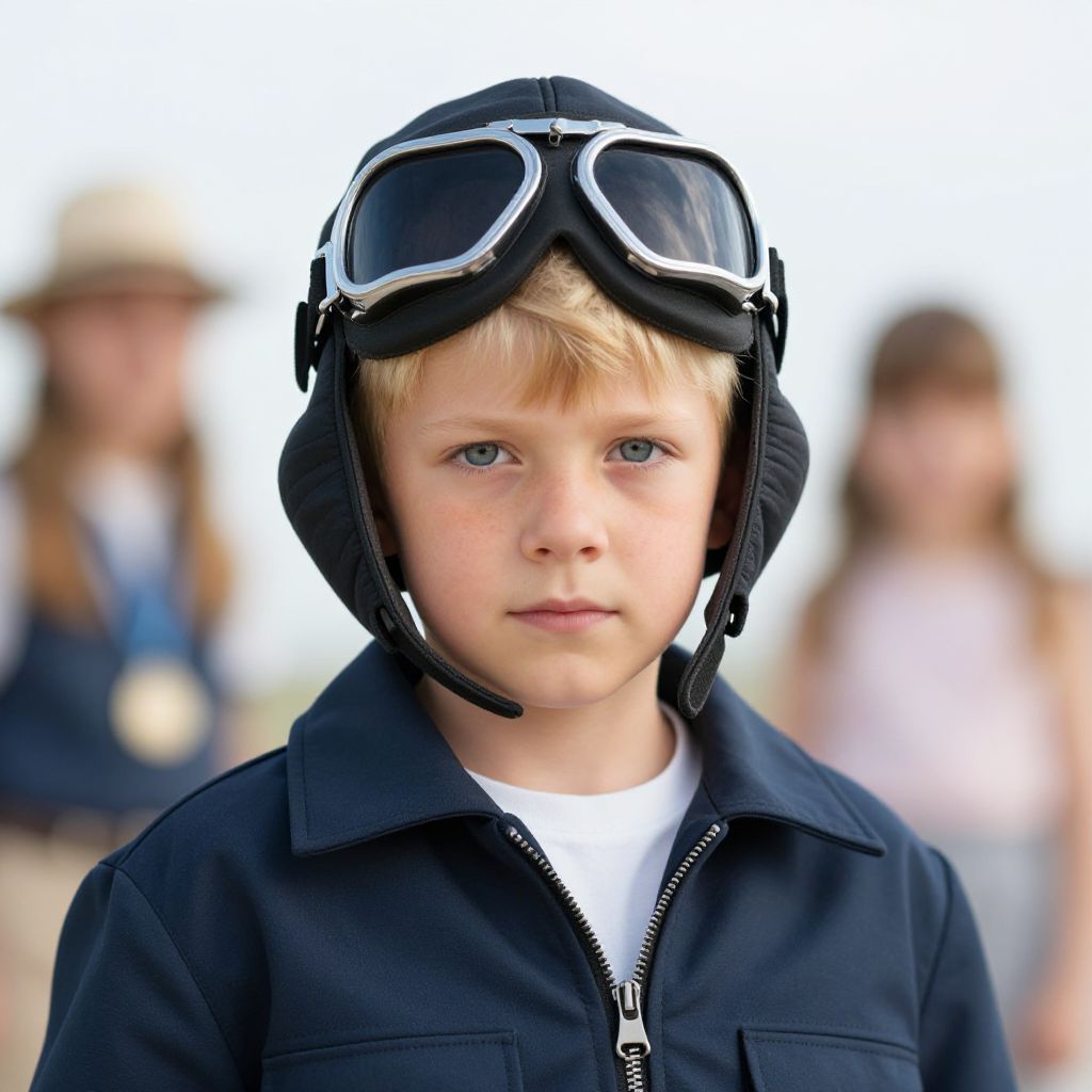 Photograph of a young blonde boy with blue eyes, wearing a black aviator helmet with goggles, and a dark zip-up jacket, blurred background of
