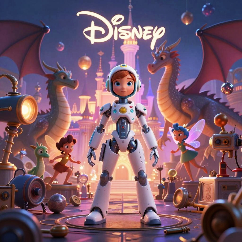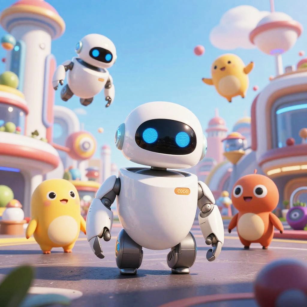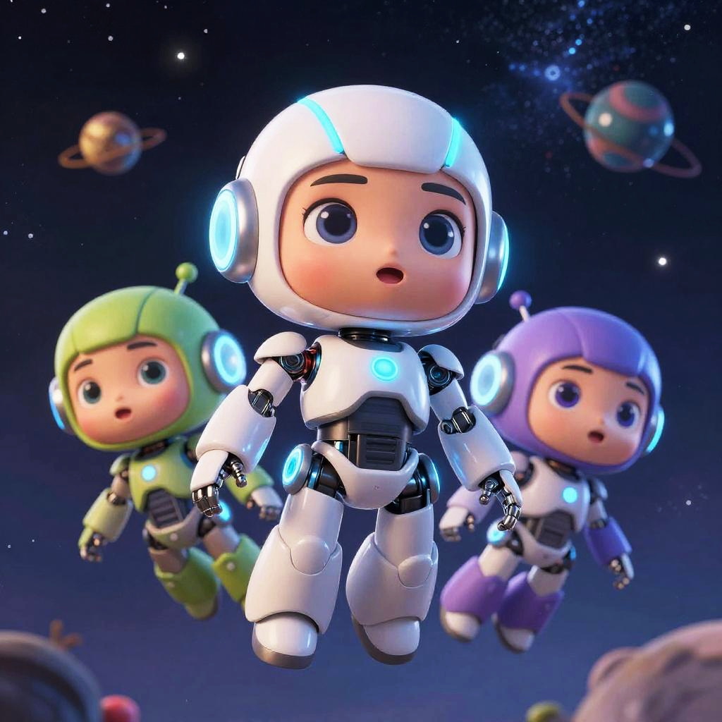 Robot girl cartoon characters in a space adventure setting, floating mid-air with starry cosmos backdrop, sleek robotic design with glowing blue accents, big expressive eyes filled with wonder, detailed mechanical features combined with soft animated style, dynamic composition with vibrant colors.