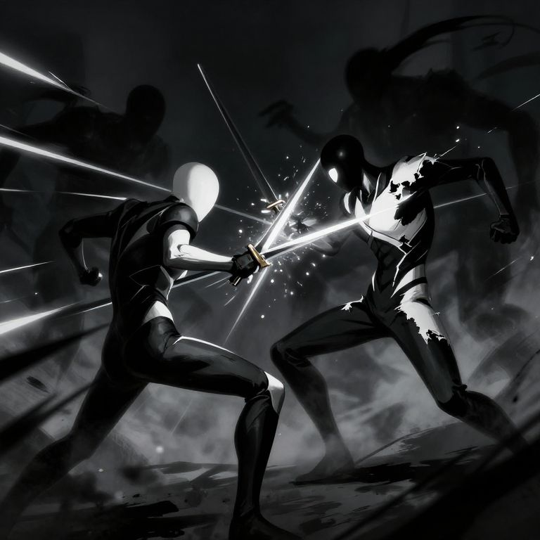 Dynamic black-and-white digital artwork of two shadowy, masked fighters clashing with bright, glowing swords amidst swirling smoke and light.