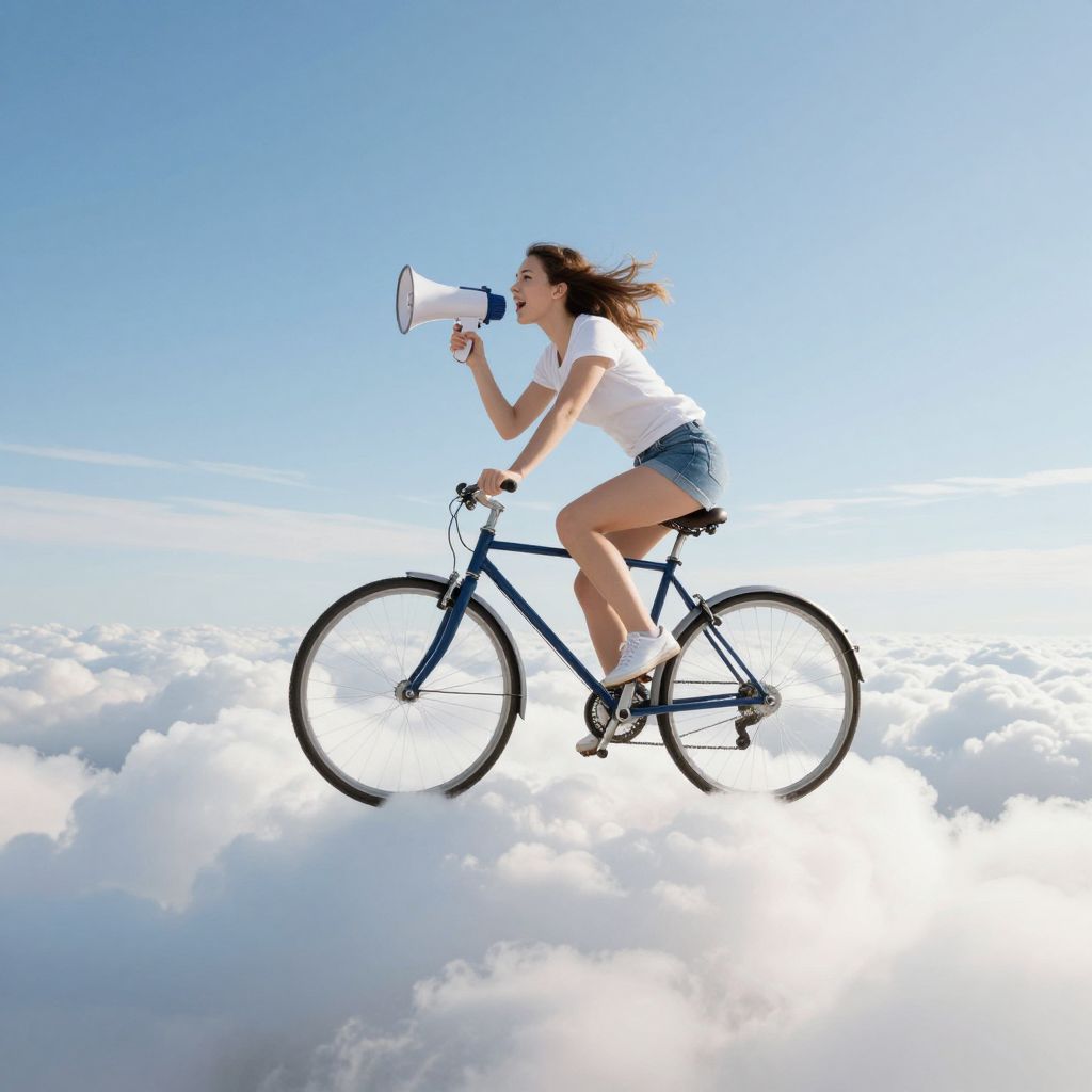A woman joyfully pedals a bicycle across a boundless sea of fluffy clouds while holding a megaphone, defying gravity and reality in a whimsical, dreamlike ascent into the heavens.
