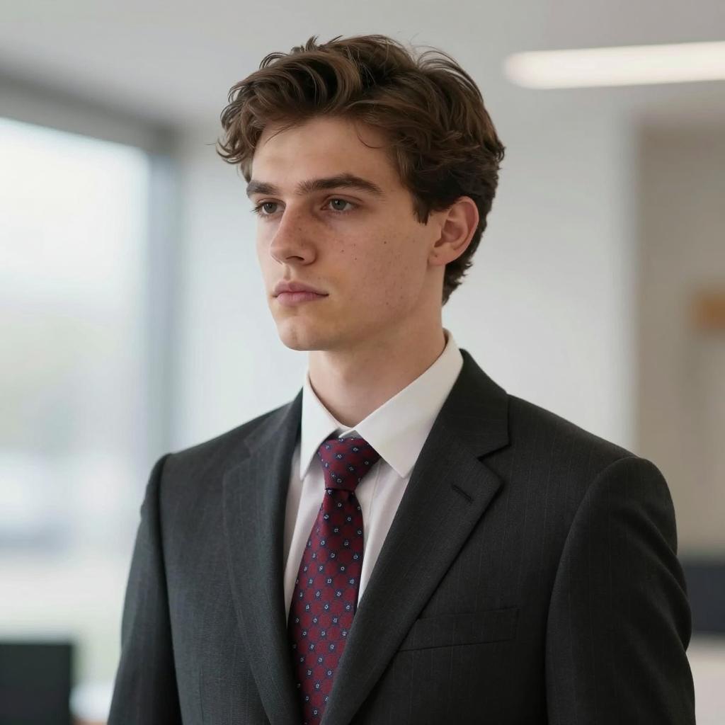 Male with light brown hair, dressed in a black suit, white shirt, and black tie, standing in front of a chalkboard filled with complex mathematical equations. He has a serious expression, slightly parted lips, and his hair is neatly combed. The chalkboard has white and red mathematical symbols and equations.