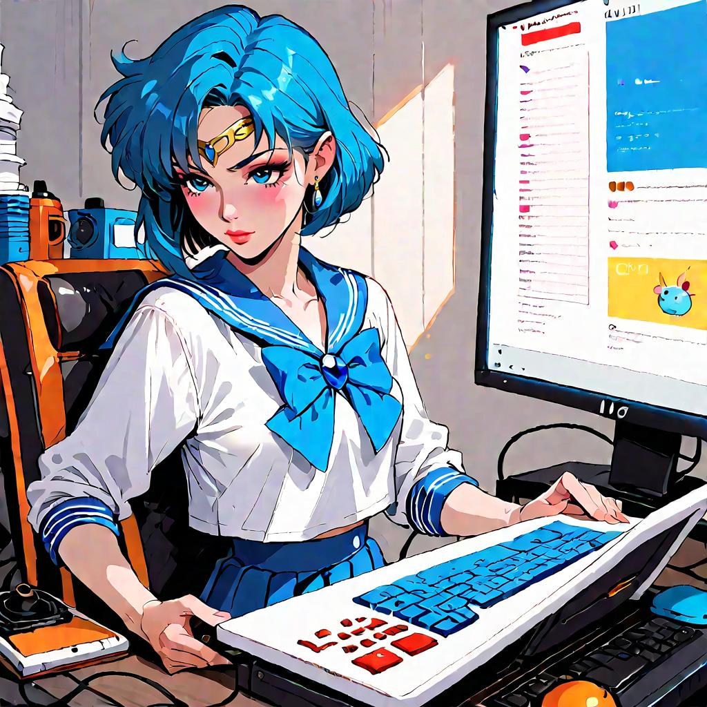 Score_9, score_8, score_7, source_anime, rating_safe, 1girl, solo, sailor mercury, blue hair, blue eyes, short hair, computer tower, working, office(artby:0)