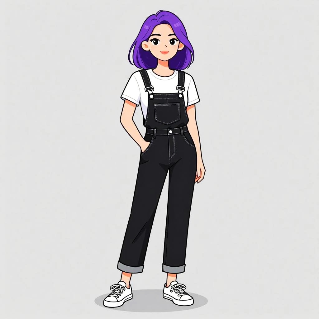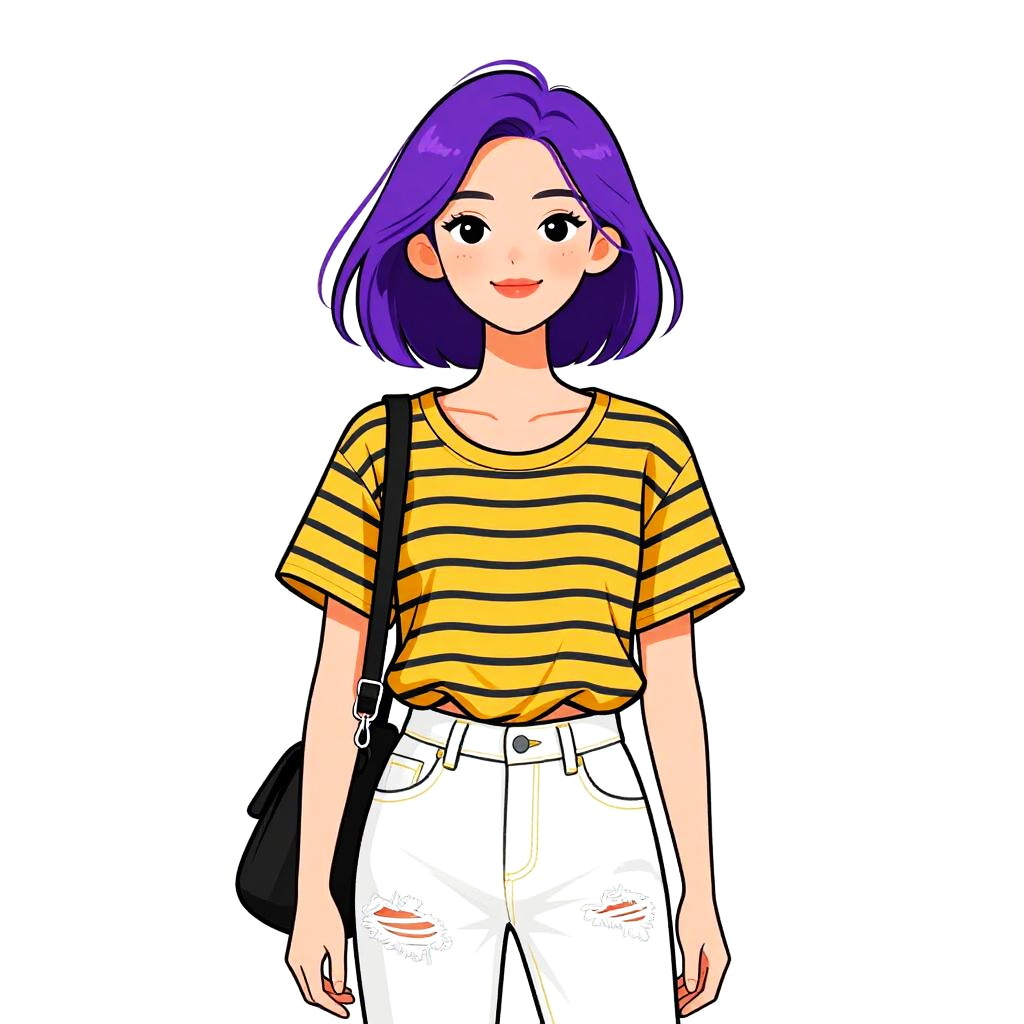 Digital anime-style drawing of a smiling woman with purple hair, wearing a striped shirt with a sunflower, blue jeans, and brown belt.