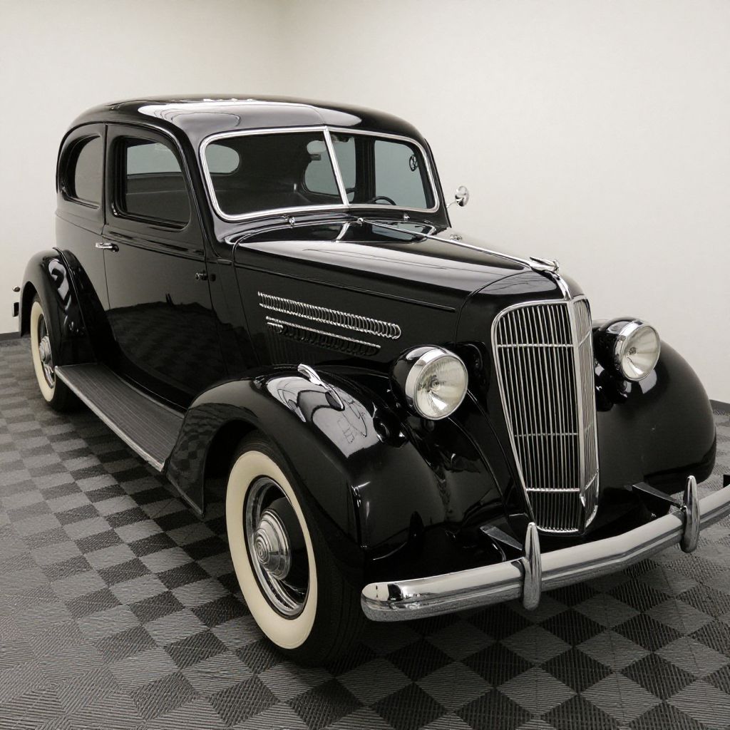 Photograph of a sleek, vintage black sedan with chrome grille, white-walled tires, and shiny finish, parked on a checkered floor.