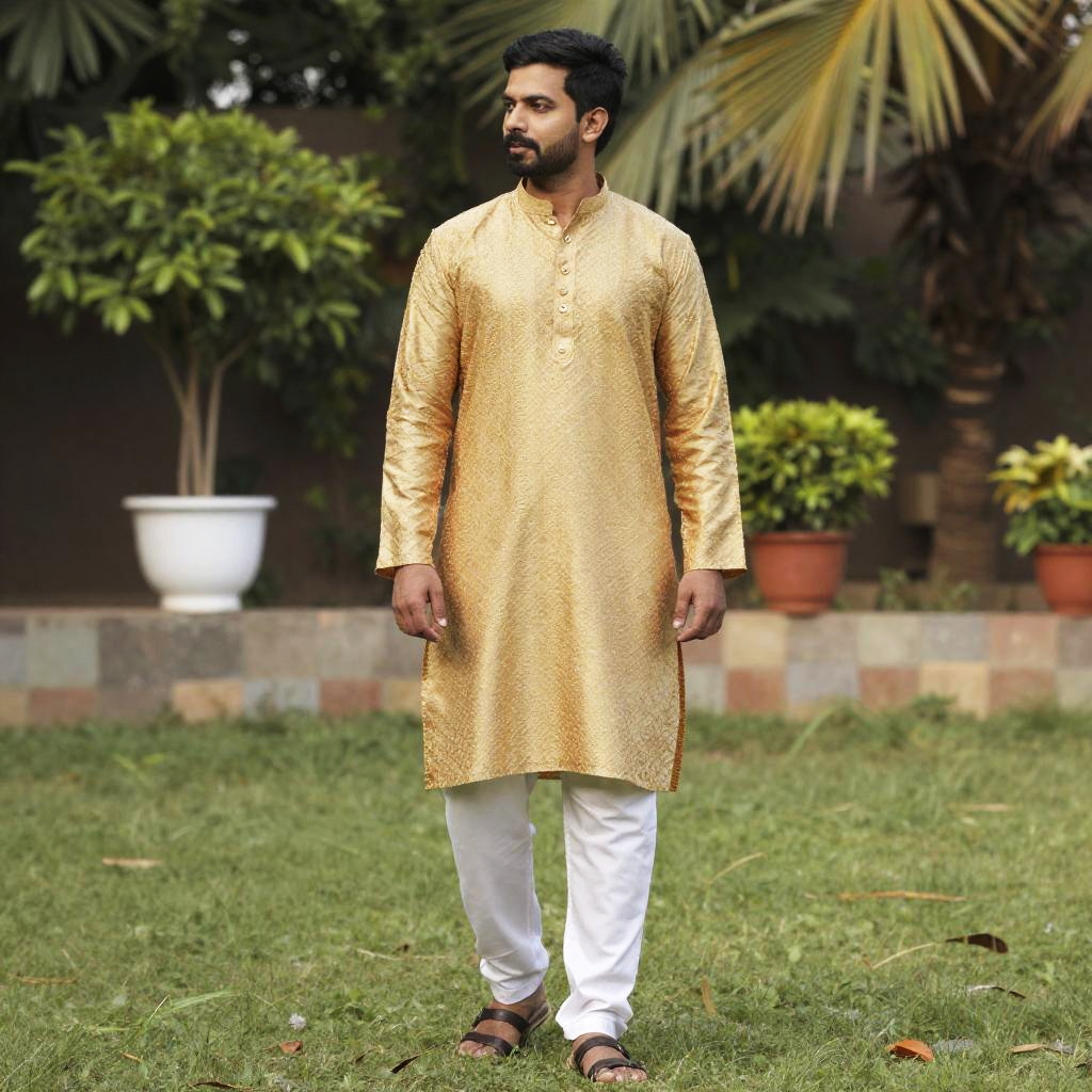 Kurta Pajama Pattern, a man in a golden kurta stands in a garden