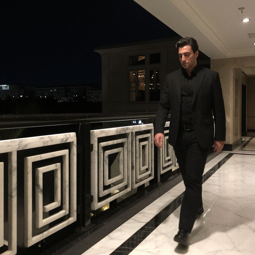 Photograph of a man in a black suit and shirt, walking on a marble balcony at night, with geometric-patterned black and white railing. City