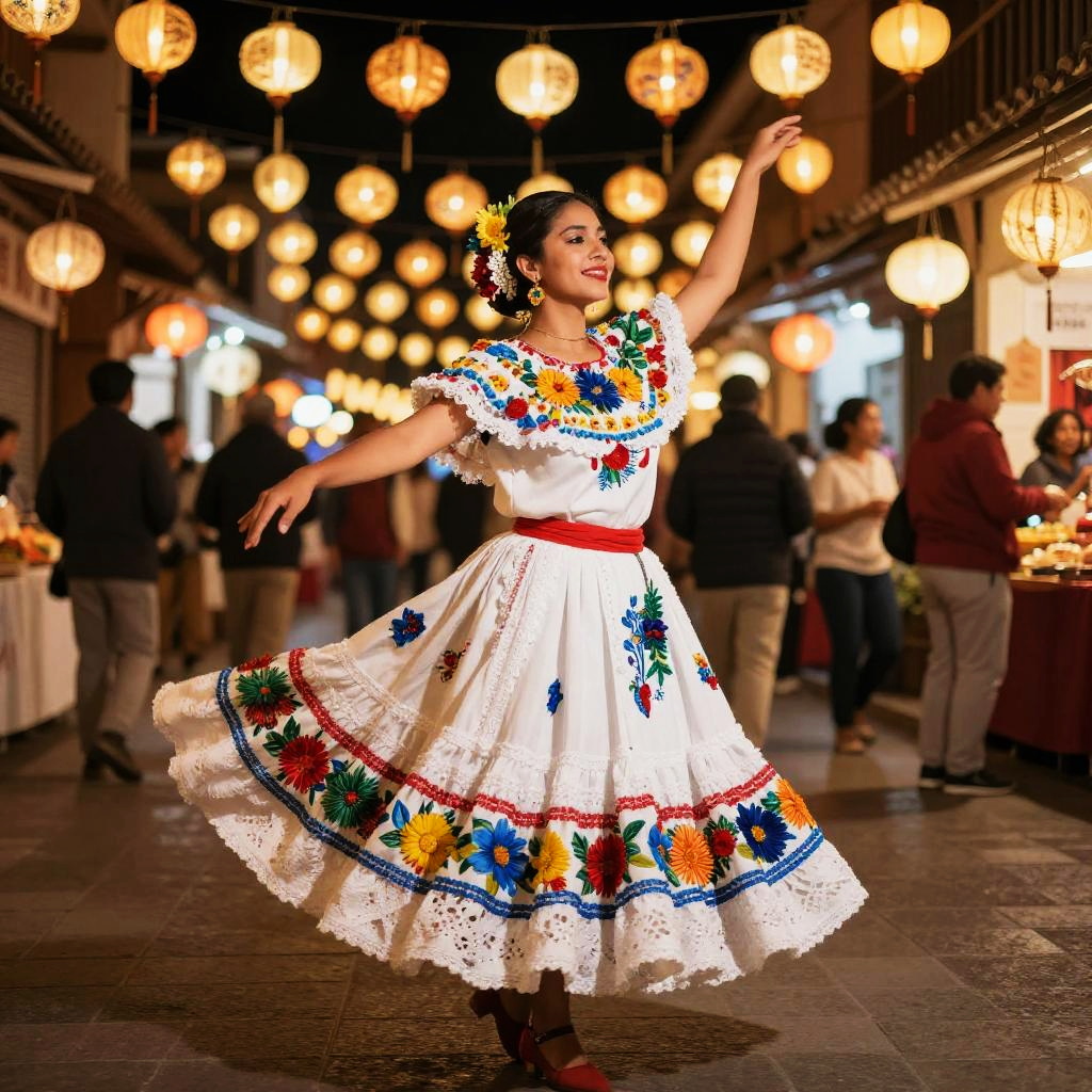Dynamic composition of a pretty Filipino woman dancing traditional folk dance, colorful attire swirling with motion, festive village background with vibrant banners and wooden houses, vivid colors, energetic and lively atmosphere, high detail