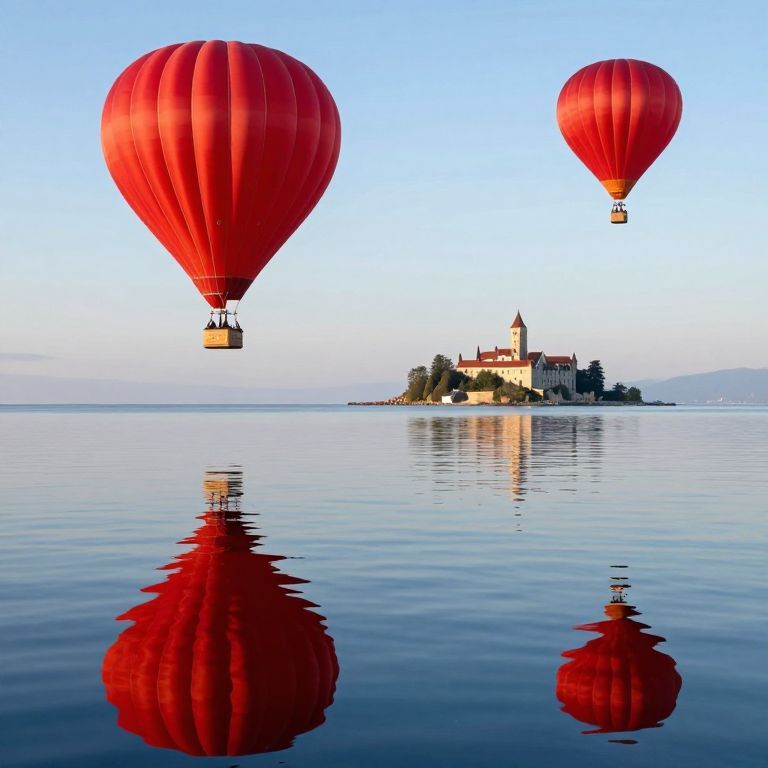 Photograph of two vibrant red hot air balloons floating over a calm, reflective lake, with a distant, small island featuring a traditional, yellow-roofed temple with a central pagoda. The sky is clear blue, and the water mirrors the balloons and island. The balloons are positioned in the upper left and upper right of the image, while the island is centered in the background. The bright red of the balloons contrasts sharply with the serene blue sky and water.