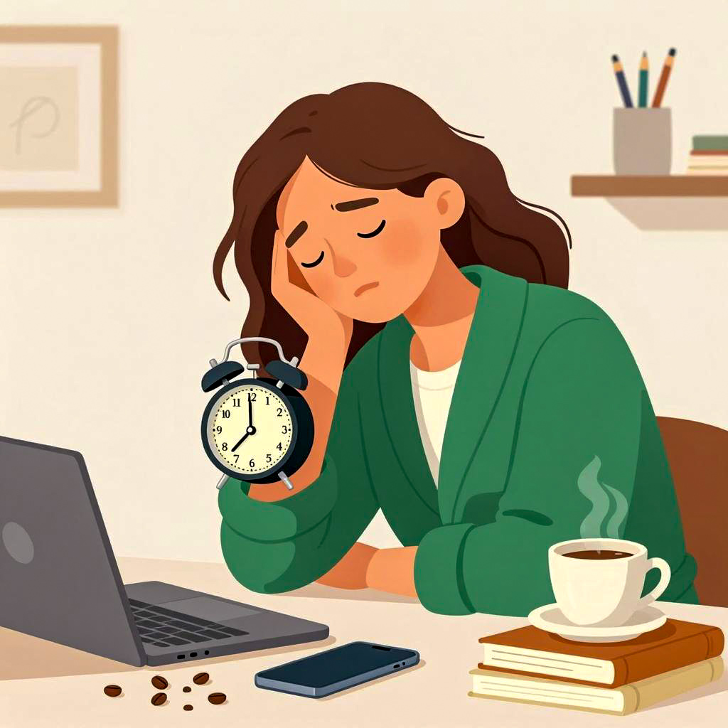 Digital illustration of a tired woman with messy brown hair, wearing a green bathrobe, resting her head on her hand. She holds an alarm clock in her right hand. A laptop, smartphone, pencil cup, scattered coffee beans, steaming cup of coffee on books, and a notebook are on the table. Her eyes are closed.