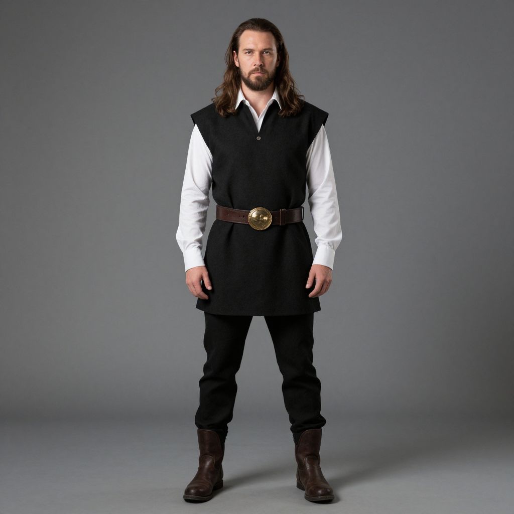 Photograph of a man with long brown hair and a beard, standing against a plain gray background. He wears a black, sleeveless tunic over a white long-sleeve shirt, black pants, and brown boots. A brown belt with a large, circular gold buckle cinches his tunic at the waist. He has a serious expression and is centered in the frame.