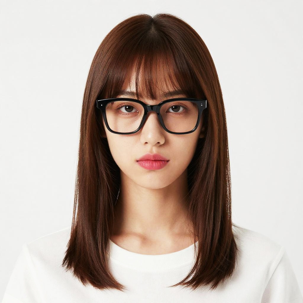 Photograph of a young Asian woman with straight, dark brown hair that falls to her shoulders, wearing black rectangular glasses with thick frames. Her bangs are straight and cover her forehead. She has fair skin, pink lips, and a neutral expression. She wears a plain white shirt against a completely white background, creating a stark contrast. The image is sharply focused, highlighting her clear skin and the texture of her hair. The overall style is modern and minimalist.