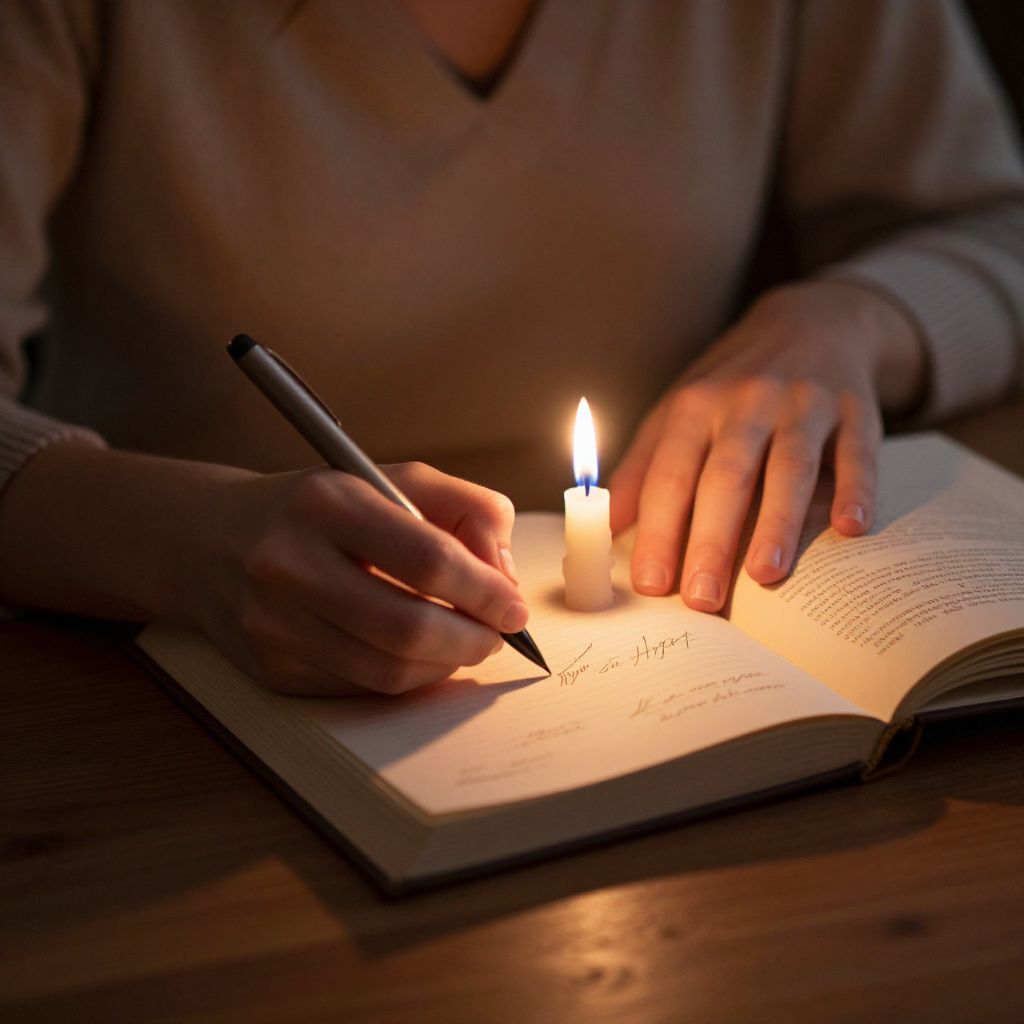A photograph captures a close-up of a person's hands writing in an open book illuminated by a small, lit candle. The hands, with light skin and neatly trimmed nails, hold a black pen and rest on the book's pages. The candle casts a warm, flickering light, highlighting the handwritten text. The person wears a dark, long-sleeved shirt. The wooden table beneath the book has a rich, textured grain. In the background, the dimly lit environment adds a cozy, intimate atmosphere. The image emphasizes the serene, focused moment of writing by candlelight.