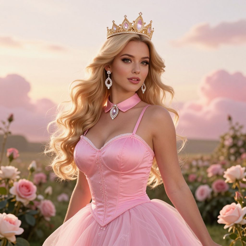 Photograph of a blonde woman with long, wavy hair, wearing a golden crown adorned with pink gemstones, and a pink satin corset dress with a full, pink tulle skirt. She has fair skin, full lips with pink lipstick, and is wearing large, diamond-shaped earrings and a matching choker necklace. The background features a field of blooming pink roses under a soft, pink and orange sunset sky. The image is highly stylized, with a fairy-tale princess aesthetic, emphasizing her beauty and regality.