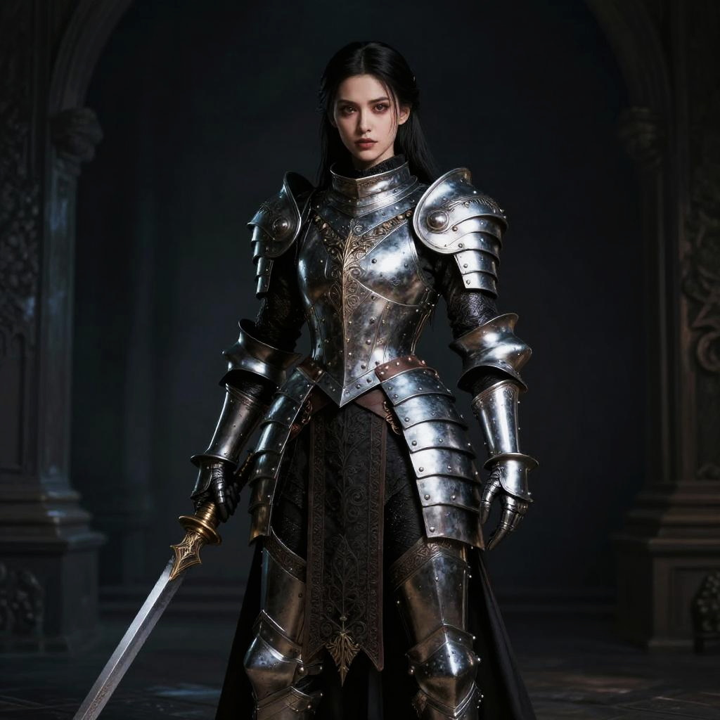Digital artwork of a serious woman in shiny, ornate medieval armor holding a sword, standing in a dark, gothic archway.