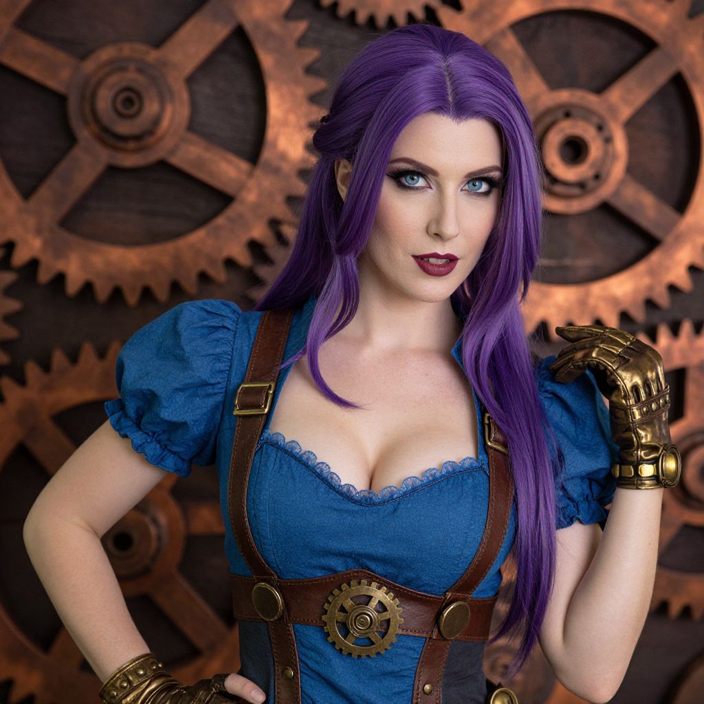 Photograph of a steampunk-inspired woman with long, vibrant purple hair and striking blue eyes. She wears a blue, puffed-sleeve dress with a deep neckline revealing ample cleavage, and brown leather straps with brass gears and buckles. Her gloves are brass-colored and she has dark red lipstick. The background features large, interlocking gears in warm, copper tones. Her expression is confident and slightly seductive.
