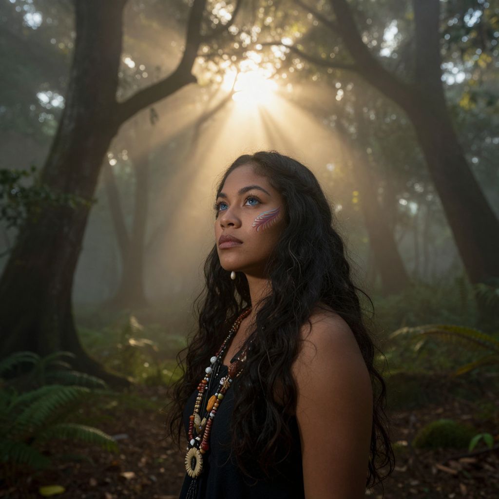 Photograph of a young woman with long, wavy black hair standing in a misty forest. Sunlight filters through the trees, creating a halo effect around her head. She has dark brown skin and wears black clothing adorned with intricate necklaces and face paint with purple and white designs on her cheeks. Her expression is calm and contemplative. The forest background is dense with tall trees, ferns, and a soft, diffused light. The image has a mystical, ethereal quality, highlighting her natural beauty and connection to nature.