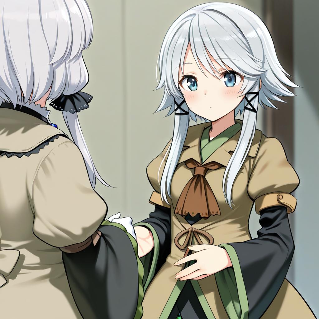 Houlen yabusame, len'en, 1other, grey eyes, grey hair, short hair, short hair with long locks, brown coat, short over long sleeves, puffy short sleeves, wide sleeves, ascot, by artist shimada fumikane, illustrious