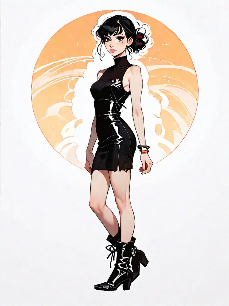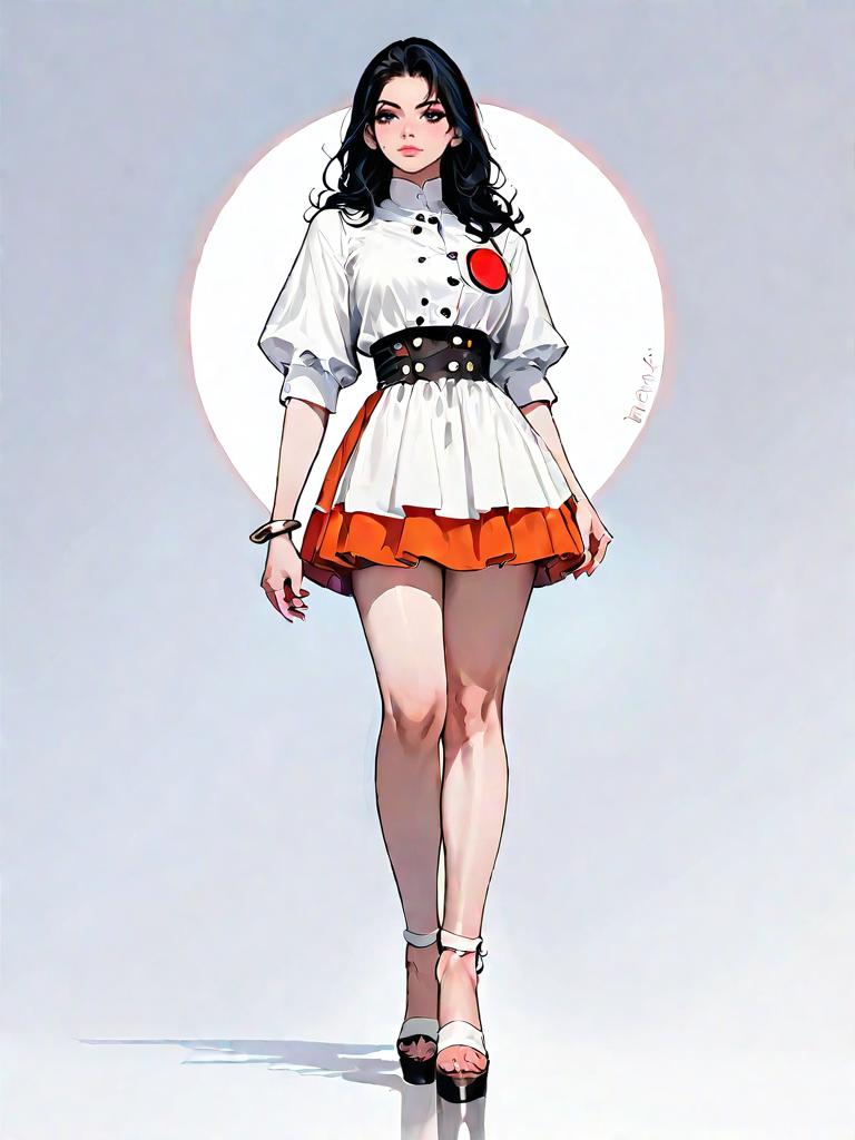 1girl, source_comics, realistic face, full body shot, Woman, modern classic, white short-sleeved top, round neckline, black A-line mini skirt, high-waisted with decorative buttons aligned diagonally, heeled open-toe ankle strap sandals, minimalist accessory with a slender bracelet, white studio background.