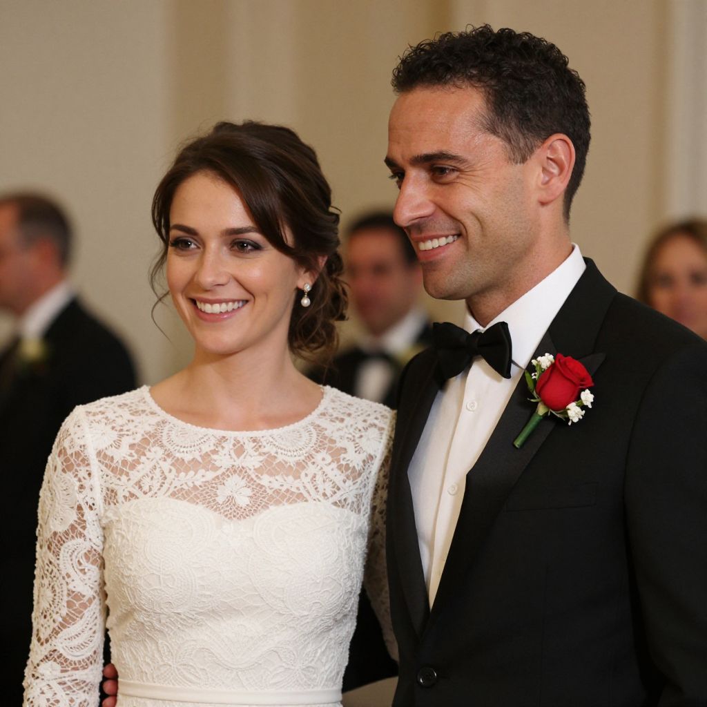 Elegant couple smiling warmly at a formal event, with the woman wearing a white lace dress and the man in a black suit adorned with a boutonniere featuring a red rose and white flower.