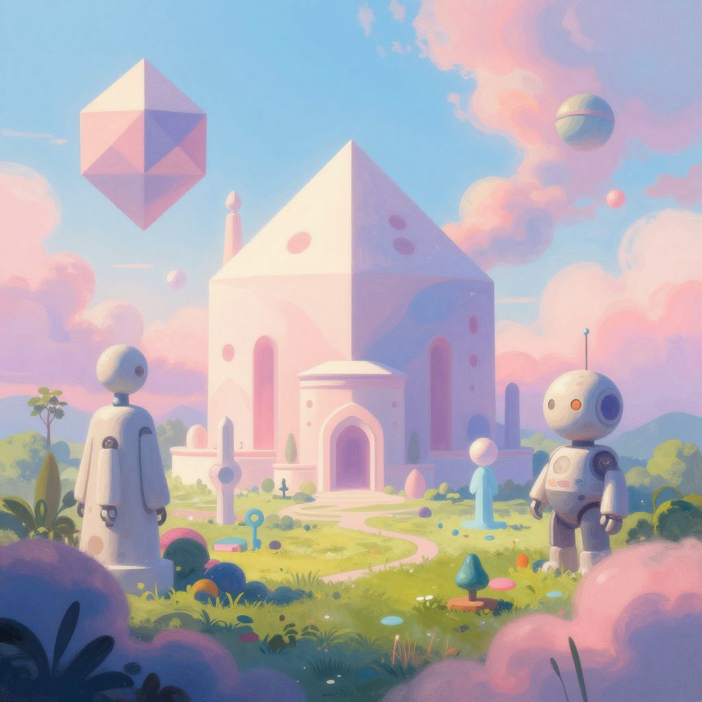 Dreamshaperxl, a surreal landscape where technology and imagination blend, featuring floating geometric shapes, dreamy pastel clouds, and abstract robotic forms intertwined with nature, ethereal and vivid color palette, fantasy digital painting