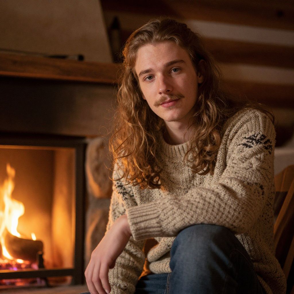 Photograph of a young Caucasian man with long, wavy, light brown hair and a mustache, sitting by a roaring fireplace. He wears a beige, knitted sweater with a dark pattern on the sleeve and blue jeans. The wooden log cabin background adds warmth, with the glowing firelight highlighting his relaxed, contemplative expression. His right arm rests on his knee, and his left hand is gently placed on his thigh. The texture of the sweater contrasts with the smoothness of his jeans, and the wooden beams overhead add rustic charm. The overall ambiance is cozy and intimate.