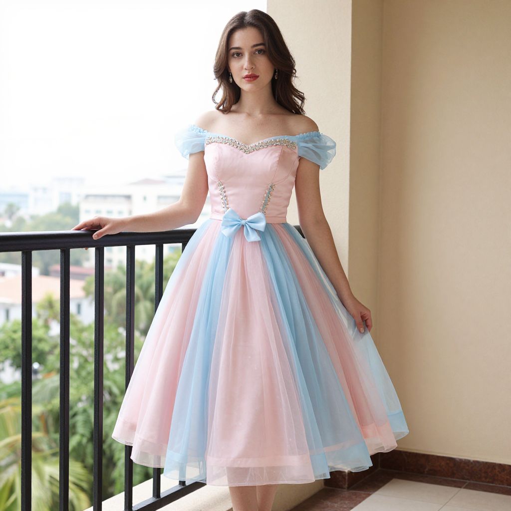 Princess Midi Dress, a woman in a pink and blue dress standing on a balcony