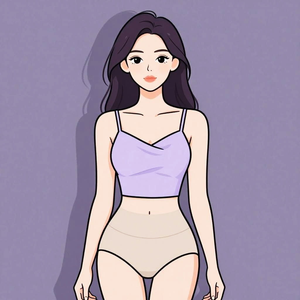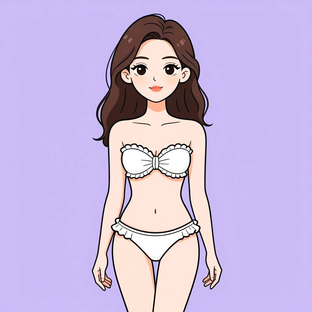 Woman with pretty face and pretty hair. Woman, beachwear, white bandeau bikini top with ruffled edging, coordinating low-rise bikini bottoms with ruffled trim, plain design, minimal coverage, studio background with a solid light color --sref 1467