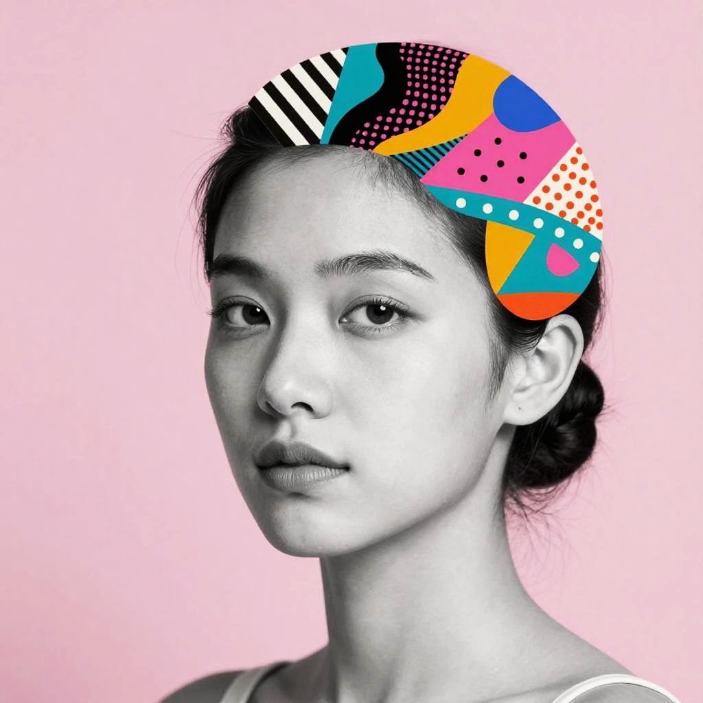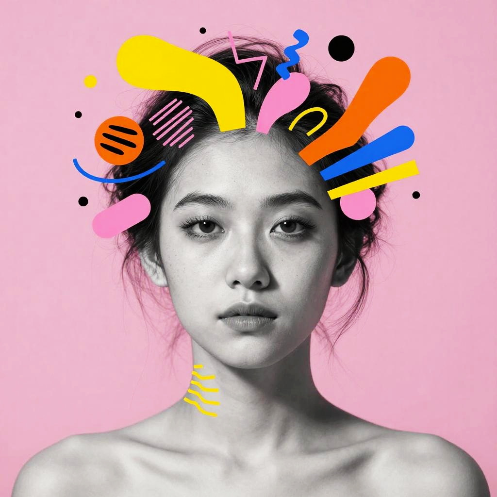 This is a digital artwork featuring a black-and-white portrait of a woman with a calm expression. Her head is adorned with a vibrant, chaotic mix of colorful geometric patterns and abstract shapes in yellow, pink, orange, and blue. The background is a solid hot pink, contrasting sharply with the black-and-white details of her face and intricate designs on her forehead and neck. The overall style is surreal and modern.