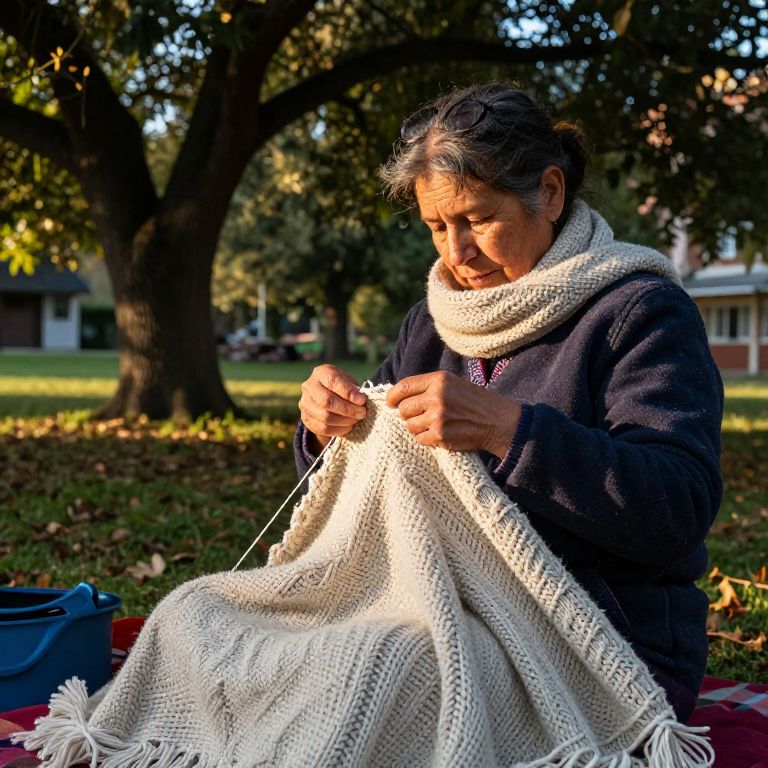 Escena de tejiendo en un parque bajo árboles frondosos, una mujer mayor tejiendo una bufanda de lana gruesa, sol de tarde iluminando suavemente, ambiente pacífico y natural, enfoque en el movimiento rítmico de los dedos y la estructura del tejido.
