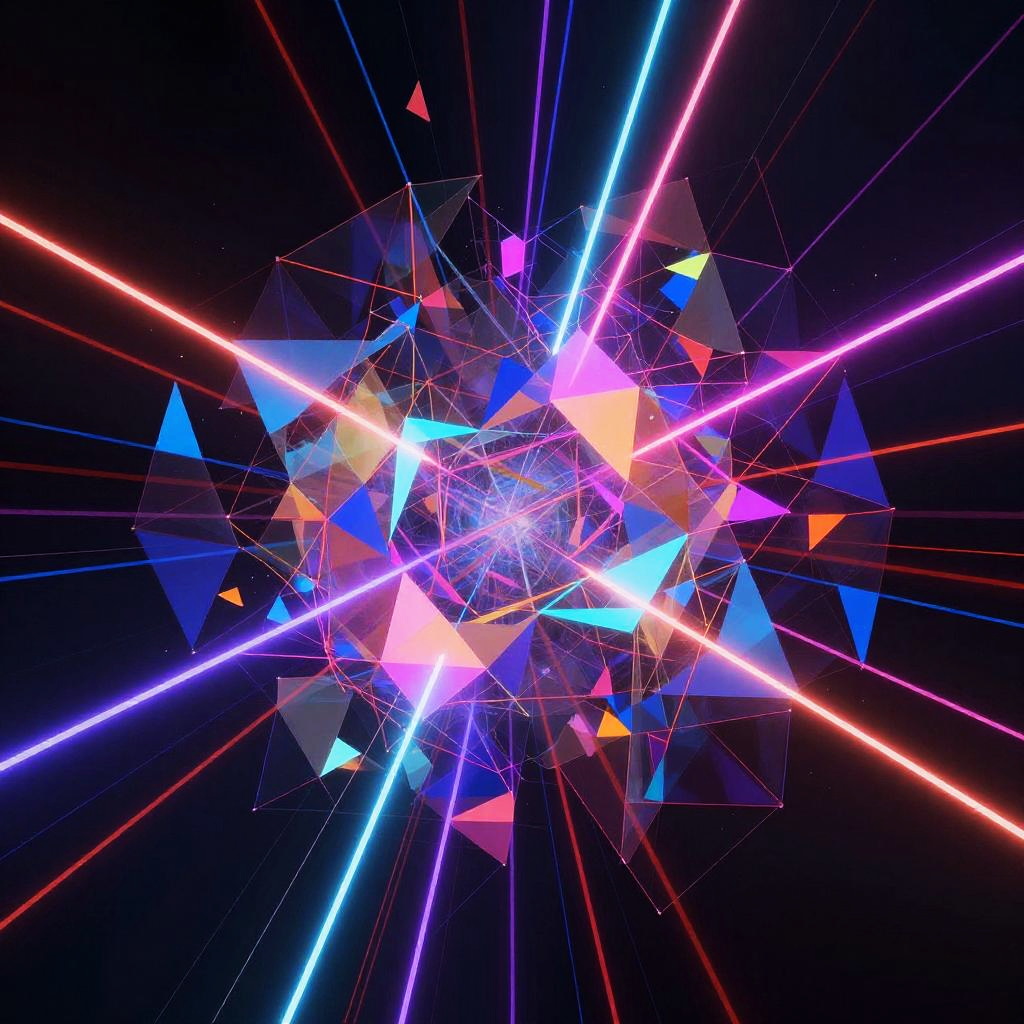 AI generated abstract art showcasing a fusion of neon light trails and fragmented polygons, creating a mesmerizing composition of chaotic harmony with bold contrasts and layered depth, reflecting the complexity of artificial intelligence.