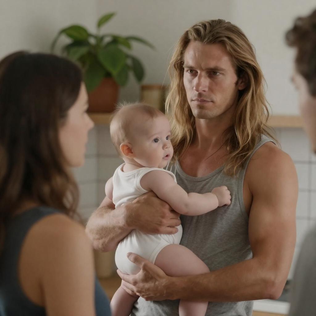 A serious-looking man with long blonde hair and a gray tank top holds a baby dressed in white. A woman with brown hair is in the foreground, slightly out of focus, looking at the man. The background features a green potted plant and a tiled kitchen wall, suggesting an indoor home setting.