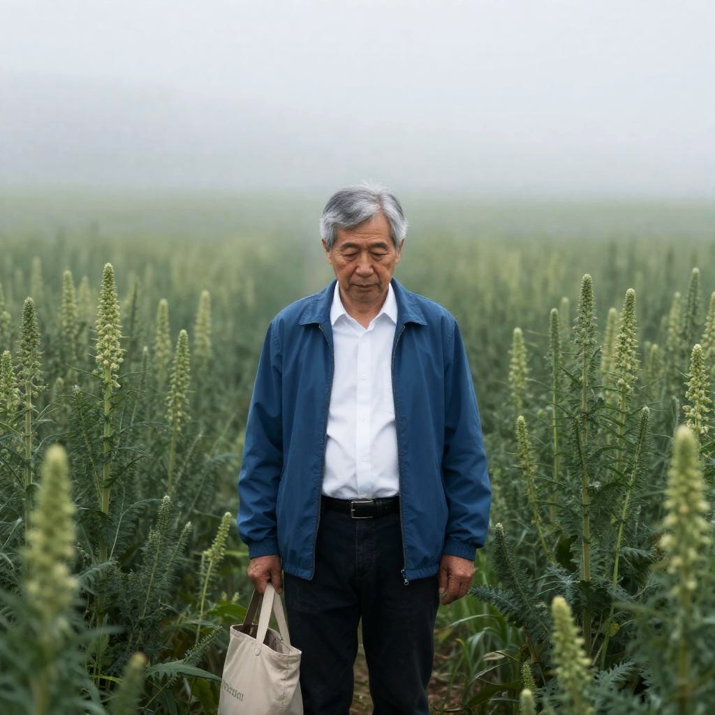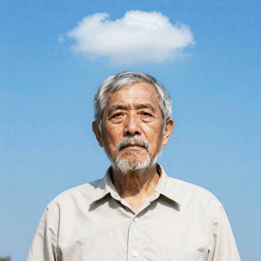 Old man with gray hair and beard, wearing a light beige shirt, centered against bright blue sky. Small white cloud hovers above his head. Serious facial expression. Clear daytime setting. Single person, surreal composition.
