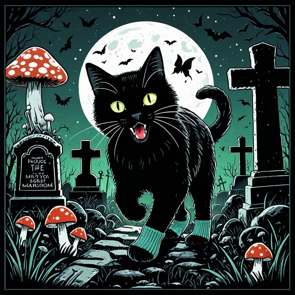 Digital illustration of a full-body black cat with yellow eyes and a mischievous grin, wearing knitted teal socks, pouncing toward a glowing red and white phosphorescent mushroom. The scene is set in a forgotten graveyard with tombstones and bats flying against a large full moon. The artwork features stylized line art, flat colors, minimal shading, and moody lighting for a playful horror atmosphere.