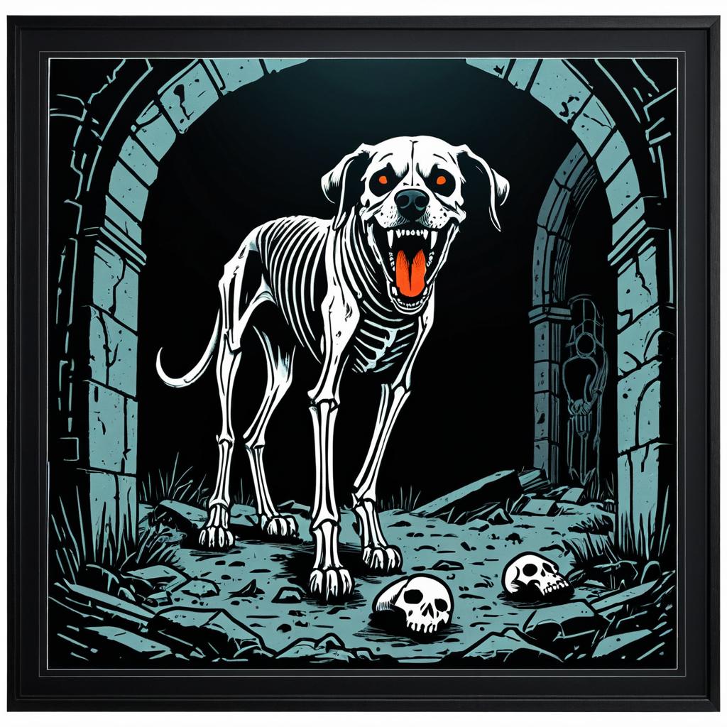 Horror-themed digital sticker of a full-body black cat in a forgotten graveyard, tongue out with a mischievous grin and wearing knitted socks as it pounces toward a glowing phosphorescent mushroom. Framed by a thick black border on a white background, rendered in flat colors with minimal shading, stylized line art and moody lighting for a playful horror vibe.
