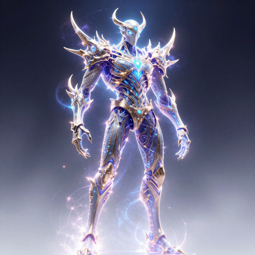 Digital artwork of a glowing, horned, armored warrior with sharp, jagged spikes, standing amidst bright, electric blue and white energy against a dark