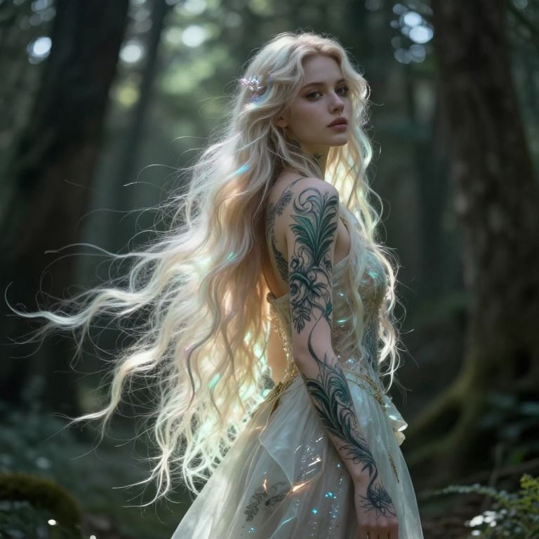 Female:uodxvvqbuve= standing in a mystical forest, ethereal glow surrounding her, long flowing hair with iridescent strands, intricate nature-inspired tattoos, soft lighting, fantasy style, highly detailed environment